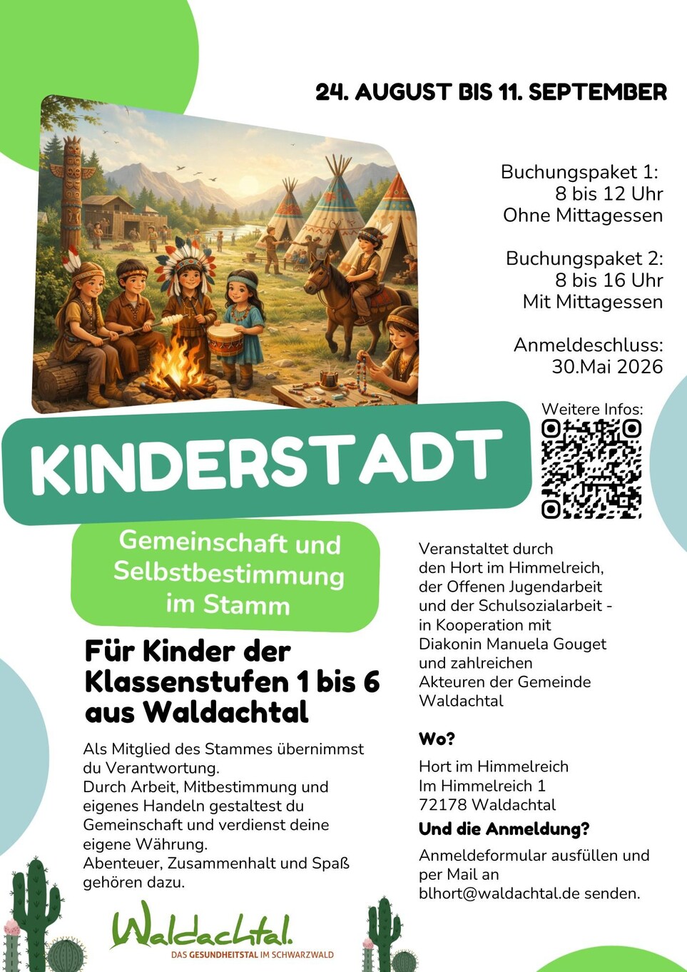 Die Kinderstadt findet vom 24.08. bis 11.09.2026 statt und wird in Absprache mit der Gemeinde vom Hort im Himmelreich, der Offenen Jugendarbeit und der Schulsozialarbeit organisiert und begleitet.