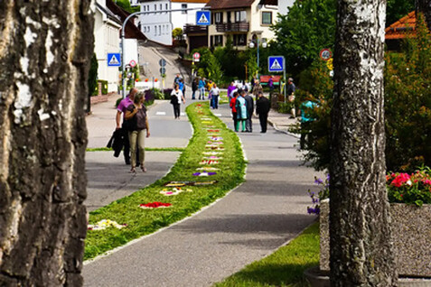 - Im Anschluss zieht die Prozession über einen ununterbrochenen 600 Meter langen Blumenteppich voller kunstvoll gestalteter christlicher Motive über mehrere Zwischenstationen hin zur Herz-Jesu-Kirche.